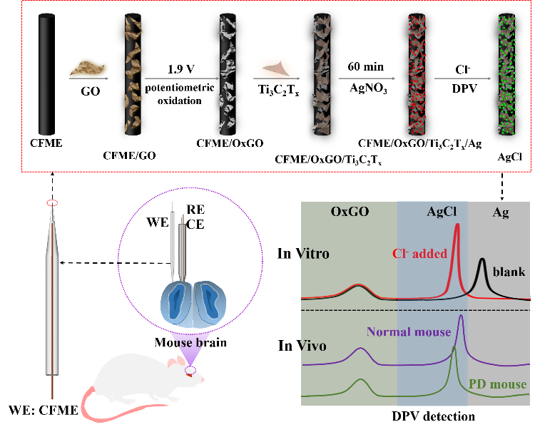 文章的标题为:Facile Electrochemical Microbiosensor Based on In Situ Self-Assembly of Ag Nanoparticles Coated on Ti3C2Tx for In VivoMeasurements of Chloride Ions in the PD Mouse Brain, Anal. Chem. 2021, 93, 7647−7656.
