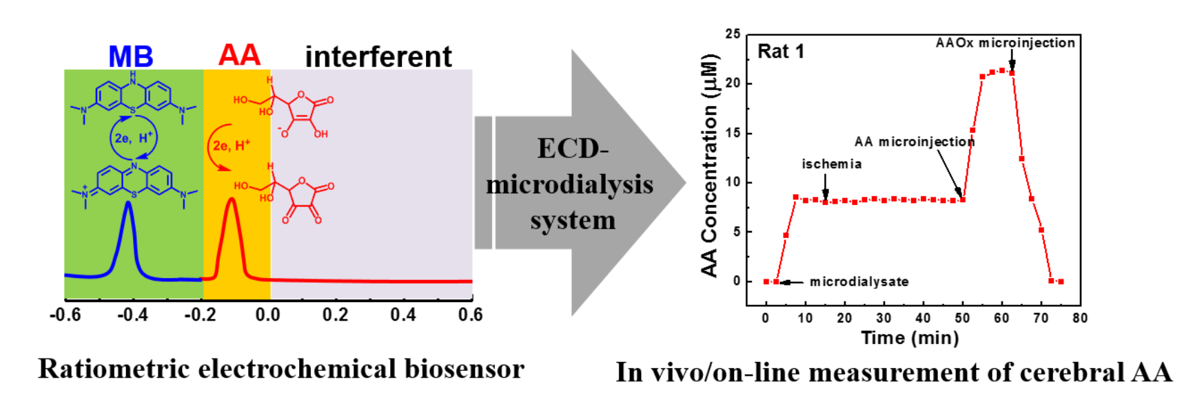 自毛兰群课题组开发了适用于活体在线分析的电化学检测-微透析(ECD-microdialysis)系统以来,由于传统的电化学传感器(ECSs)对脑内AA的电化学氧化电位较正,选择性差,且AA氧化的电子传递动力学较慢,至今未有适用于该系统的AA电化学传感器报道。基于此,谷慧博士设计了一种简单、高灵敏、高选择性的AA比率型电化学传感器,用于活体脑内AA的在线重复检测。他们将氧化石墨烯(GO)电沉积于电极表面,并静电吸附亚甲基蓝(MB)于其表面作为内参比分子,以此构筑比率型电化学检测器(RECS)。随后,通过简单的电还原处理促进AA的电化学氧化,将AA的电氧化峰电极负移至-100 mV,该氧化峰与MB的氧化峰电位(-428 mV)实现基线分离,可以实现AA的比率电化学检测。接下来的体外实验表明,RECS对AA的测定具有较高的灵敏度(检测限:10nm)、选择性和稳定性,可实现对活体脑内AA的在线重复测定,具有较高的可靠性。该RECS进一步被成功地用于ECD-microdialysis系统,实现了大鼠脑缺血/再灌注病理事件中脑内AA的动态监测。此外,内源性AA和AA氧化酶(AAOx)的微注射验证了所设计的RECS用于活体脑内AA在线重复检测的可靠性。