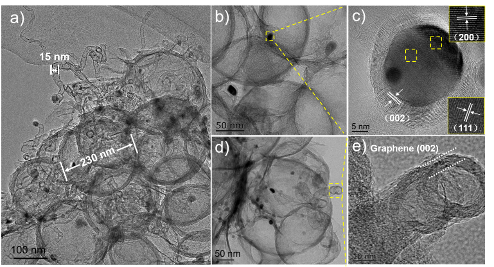 图2TEM图像:(a) CoNi/NHCS-TUC-3;(b-c)嵌入空心球壳的金属颗粒和(d-e) 管状碳。