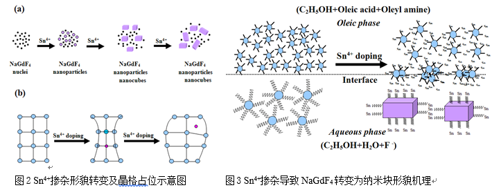 在此,我们在前期通过掺杂Sn2+离子来提高上转换发光强度的基础上(CeramicsInternational, DOI.org/10.1016/j.ceramint.2019.06.225),进一步设计采用Sn4+离子来增强上转换发光。然而,有关Sn4+离子掺杂的报道还不多见,其主要原因有以下两个方面:(1) 离子半径和电荷数的差异使掺杂的Sn4+离子难以进入基质主晶格;(2) Sn4+极易水解,可能在最终产物中引入杂质。
