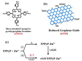 由氧化石墨烯出发通过化学还原法可制备还原程度递增的还原氧化石墨烯(rGO),其表面带有梯度减少的负电荷量,阳离子卟啉(5,10,15,20-四[4-丙基吡啶基]卟啉,TPPyP)可自发组装到其表面获得rGO/TPPyP,进一步发现在常温下Zn2+可有效嵌入到卟啉环内形成rGO/TPPyP-Zn复合物,且嵌入速度与rGO表面电荷量直接相关。实验结果表明rGO上TPPyP的组装和Zn2+的嵌入过程会导致紫外可见吸收光谱中的卟啉特征吸收峰明显红移,原子力显微镜下的二维纳米片厚度发生变化,荧光光谱发生显著的猝灭效果。由此发展了一种在常温下可控制备水溶性金属锌卟啉-石墨烯纳米复合材料的新方法(专利授权号:ZL 201610041189.8),而且所制备的rGO/TPPyP-Zn纳米复合材料具备较高的光电催化活性。