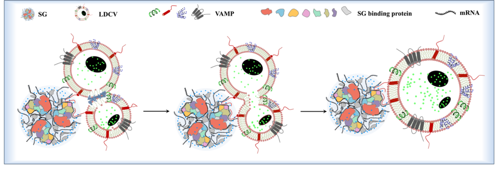 本工作中,我们还提出了一种同型融合的假设机制,即SG 外壳中富集的mRNA 或蛋白质可能与囊泡相关膜蛋白(VAMP) 的本质无序蛋白(IDP) 区域结合,驱动两个紧密缠绕的囊泡之间破裂的膜相互融合形成双核囊泡(图4)。