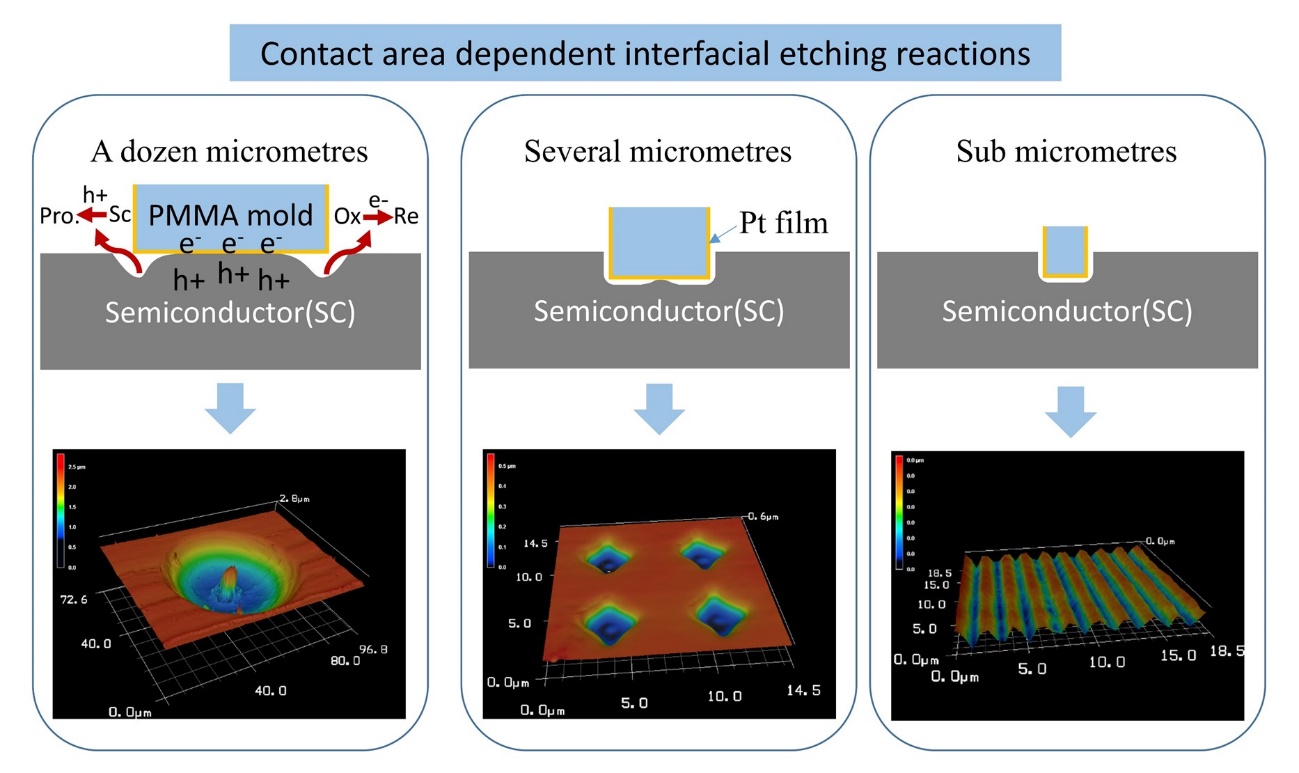 电化学纳米压印技术是一种基于金属辅助刻蚀原理和纳米压印工作模式的新型电化学纳米制造技术。目前该技术已成功现实了Si, GaAs等主流半导体器件材料的简单二维和复杂三维微纳米结构的批量加工。然而受模板与基底之间纳米尺度超薄液层钝化和扩散传质的限制,目前仍难以实现高深宽比纳米结构的加工。张杰博士课题组通过调控接触力改变接触面积,研究电化学纳米压印过程中不同接触面积下的尺寸效应。通过有限元方法建立了电化学纳米压印的刻蚀与传质模型,将非均匀的界面刻蚀与超薄液层中非均匀钝化和传质效应相关联。结果表明数十微米接触面积将会导致半导体表面彻底钝化,仅有接触边缘发生轻微刻蚀;数微米接触面积将会导致半导体接触中心发生轻微钝化,形成中心数十纳米的突起;亚微米接触面积时钝化效应消失,压印结构与模板完全互补。上述不均匀界面刻蚀效应是由超薄液层中非均匀钝化和传质效应导致的。该研究成果对电化学纳米压印的工艺优化具有指导意义。