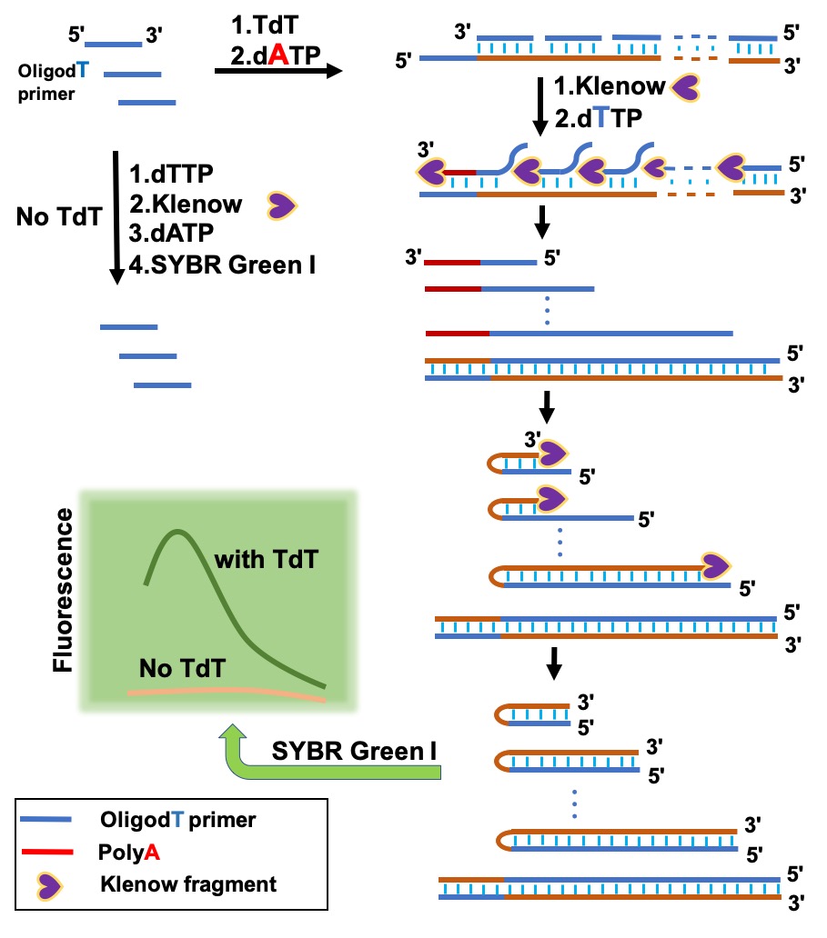 基于此,邓克勤副教授课题组提出了一种基于荧光的多位点链置换反应扩增策略(MSSDR)用来快速定量TDT活性的新方案。他们设计了oligo dTn(这里n代表碱基T的个数)作为引物,采用dATP作为唯一的脱氧核苷酸源。在TdT与dATP存在下,引物Tn被延伸,形成长PolyA尾的单链DNA TnAx(n 表示碱基T的数目,x代表碱基A的数目)。然后,剩余的引物Tn将端对端地与Ax结构域杂交;在Klenow酶和dTTP存在下,以TnAx作为模板和Tn作为引物启动多位点链置换扩增(MSSDR),生成不同长度的大量单链DNA AnTy(y表示碱基T的数目,其中y = n,2n,3n)...,y ≤ x)。因为AnTy的3'部分An与其自身的Ty结构域序列互补,所以An结构域将折回并与相邻Ty结构域杂交,然后Klenow酶片段通过使用An序列作为引物和Ty结构域为模板来补齐单链部分。最后,加入与双链DNA特异结合的SYBR Green I(SG)染料通过荧光分析定量TdT。与以往发表的工作不同的是,他们没有使用TdT合成序列来形成纳米粒子或利用它们的类酶属性来获得检测信号,而是巧妙的利用了引物与TDT延伸产物、TDT延伸产物与自身的序列互补,仅采用一条oligo dT引物,通过直接扩增TdT合成序列得到明显的检测信号。