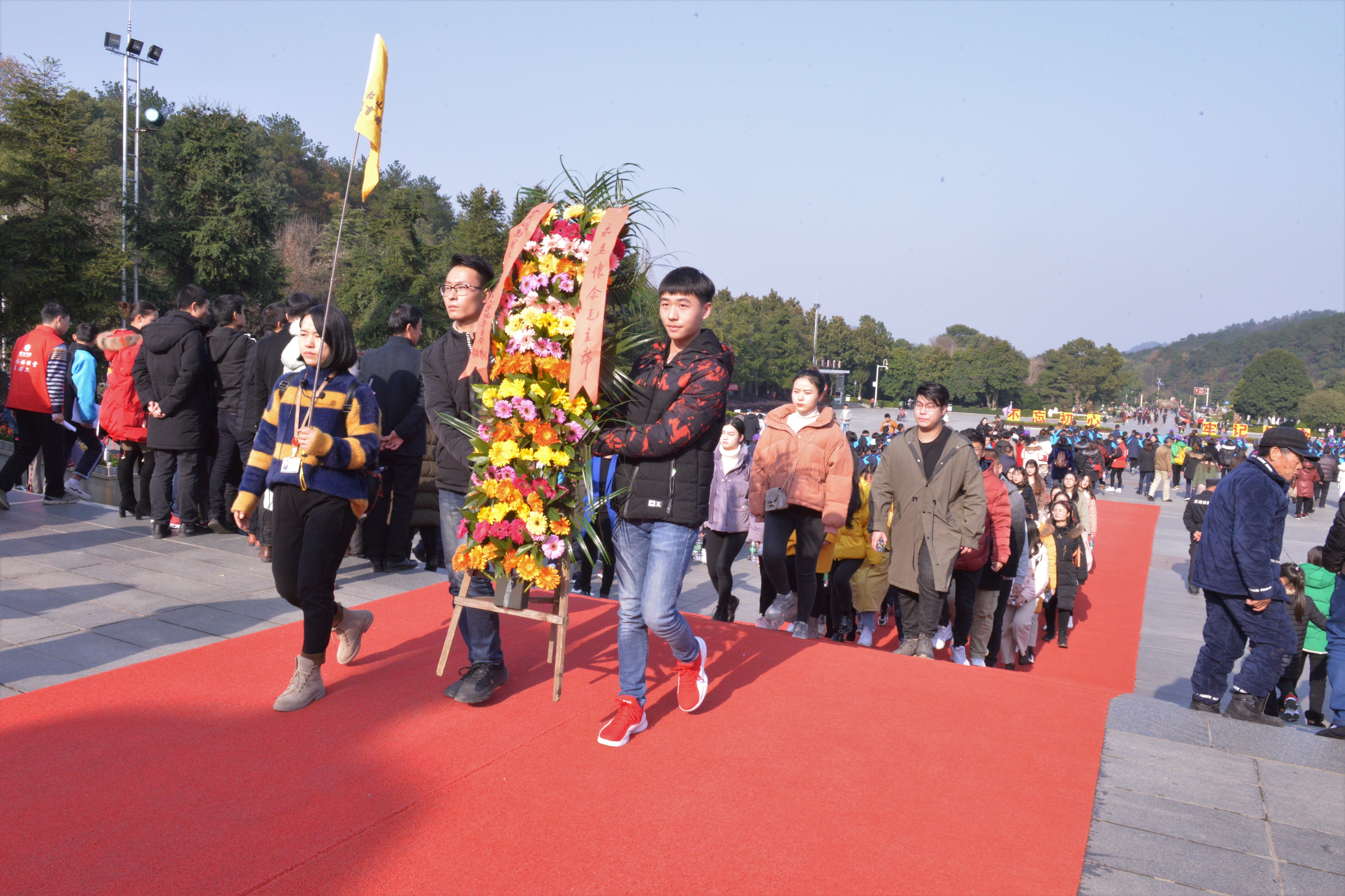 活动的第一站是全体党员向毛主席铜像敬献花篮,毛主席铜像身躯高大,体态稳健,面带微笑又沉思。党员们在毛主席铜像前肃穆而立,以鞠躬礼表达了对毛主席崇高的敬意,展现出了新时代的青少年不忘先辈,励志奋发的精神。