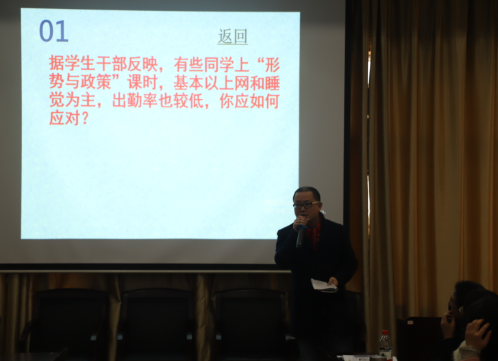 大赛共分为四个环节。12月17日下午,全体辅导员在一教学楼101教室参加了理论考试,理论考试的内容包括由基础知识和网文写作两部分。通过二级学院推荐和学生工作部抽签两种方式产生的18名辅导员参加了案例分析、谈心谈话、理论宣讲三个环节的竞赛。案例分析环节,参赛辅导员围绕学生日常管理和思想政治教育实际工作中有可能遇到的形形色色的案例,从问题本质、解决思路、实施办法及相关启示进行了精彩阐述。在谈心谈话环节, 参赛辅导员围绕学生管理案例, 分别扮演辅导员和学生的角色,以情景再现的方式开展谈心谈话。参赛选手熟悉运用政策、理论与科学方法,迅速寻找谈话关键点,理论联系实际,过程鲜活生动,博得现场观众阵阵掌声。在理论宣讲环节,参赛辅导员围绕抽到的“初心与使命与”、“从严治党永远在路上”、“文化自信”等主题为现场观众带来了一场内容丰富、深入浅出的思想理论宣讲。