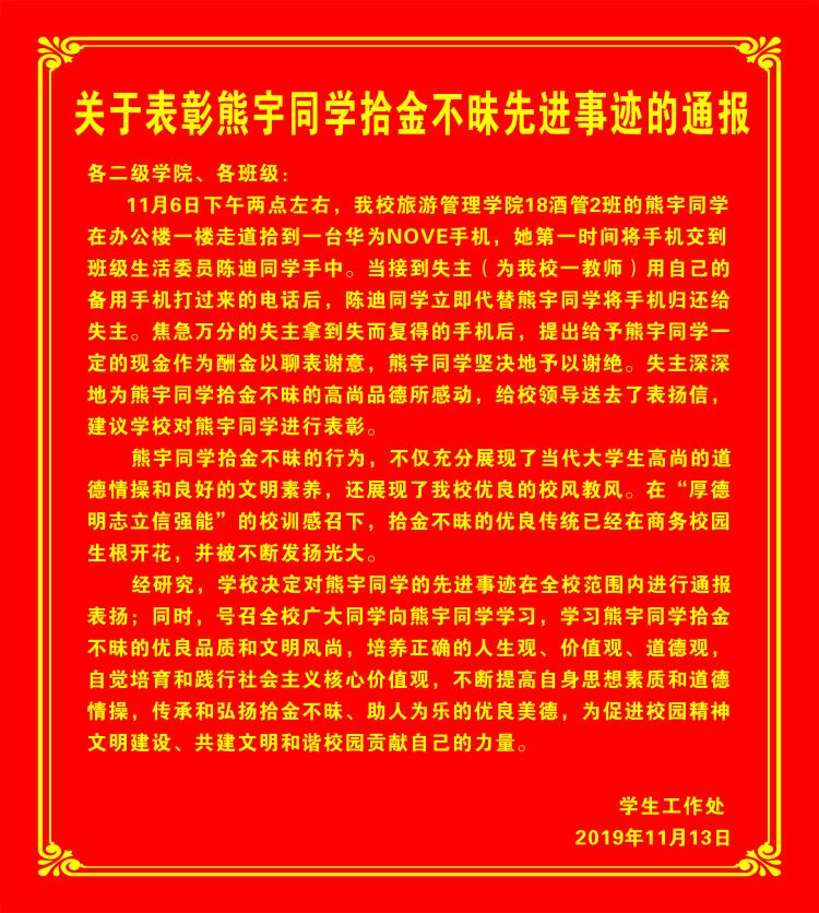 关于表彰熊宇同学拾金不昧先进事迹的通报