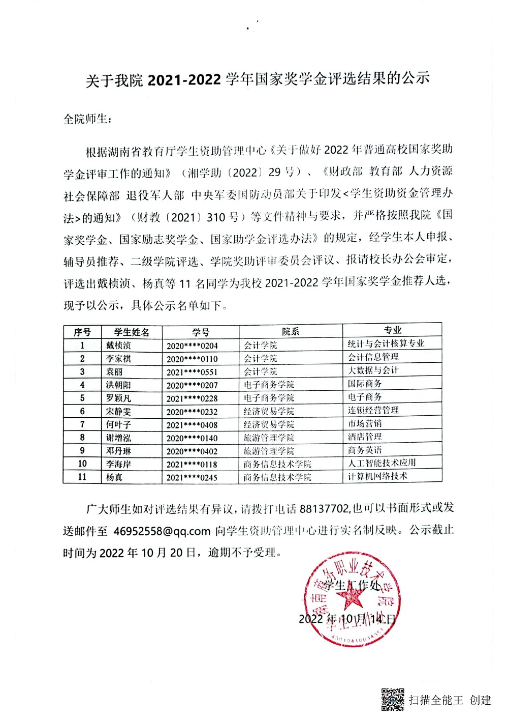 关于我院2021-2022学年国家奖学金评选结果的公示