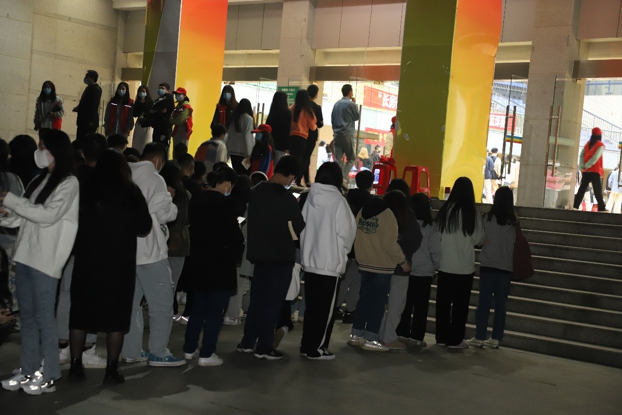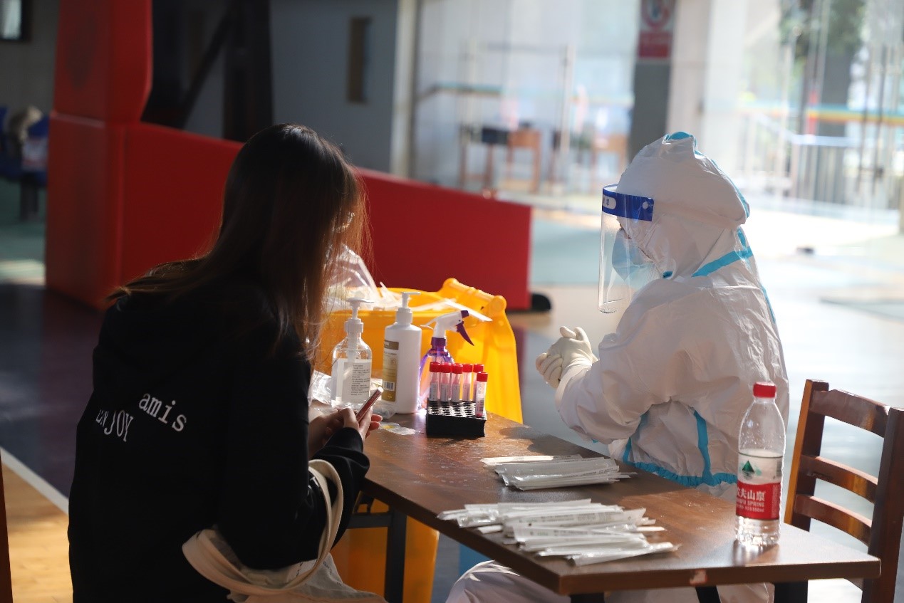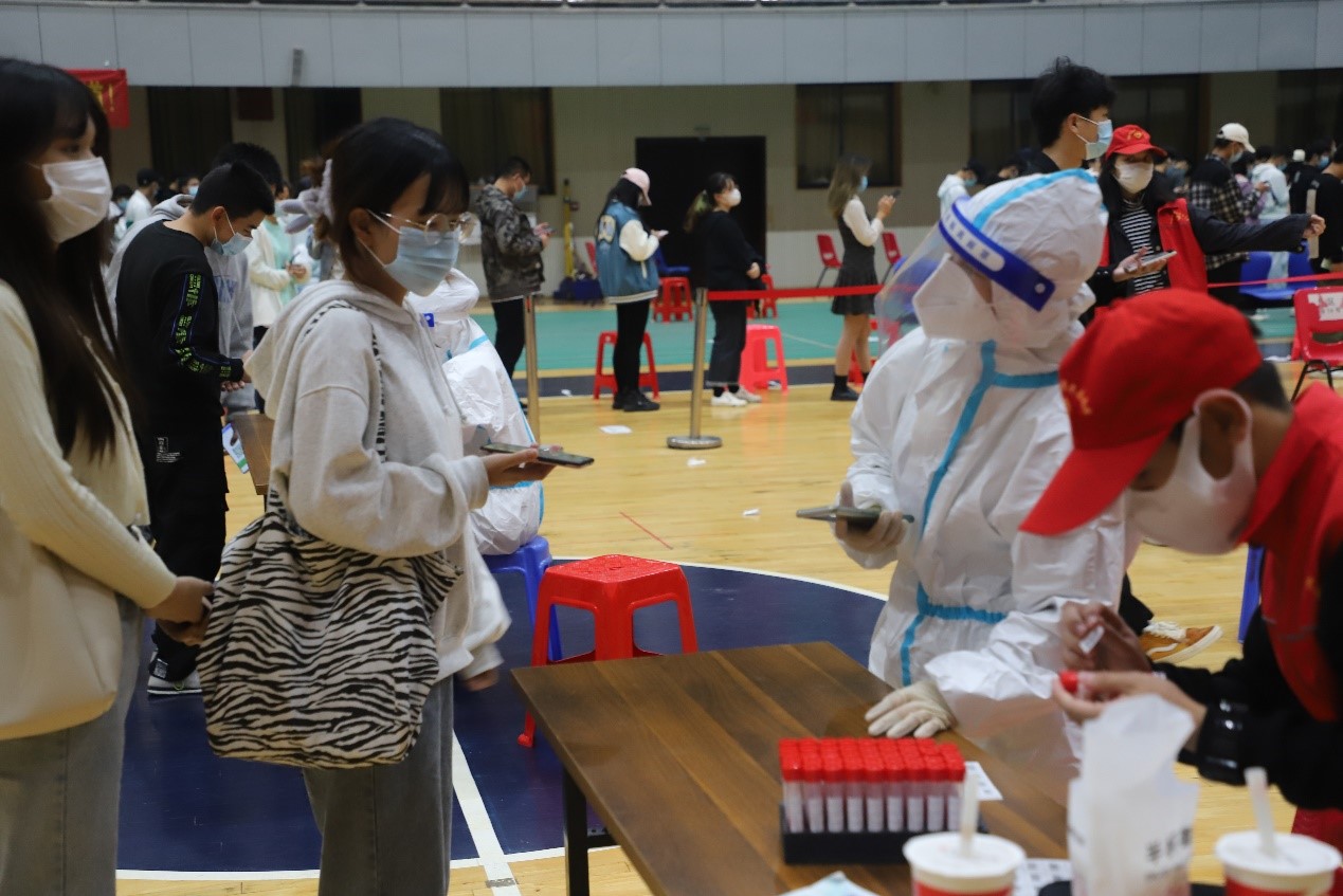 现场人员繁多,白衣天使们耐心仔细地为同学们做核酸检测,志愿者和安保人员认真负责地管理现场秩序,同学们也积极配合工作人员,使得整个现场井然有序。