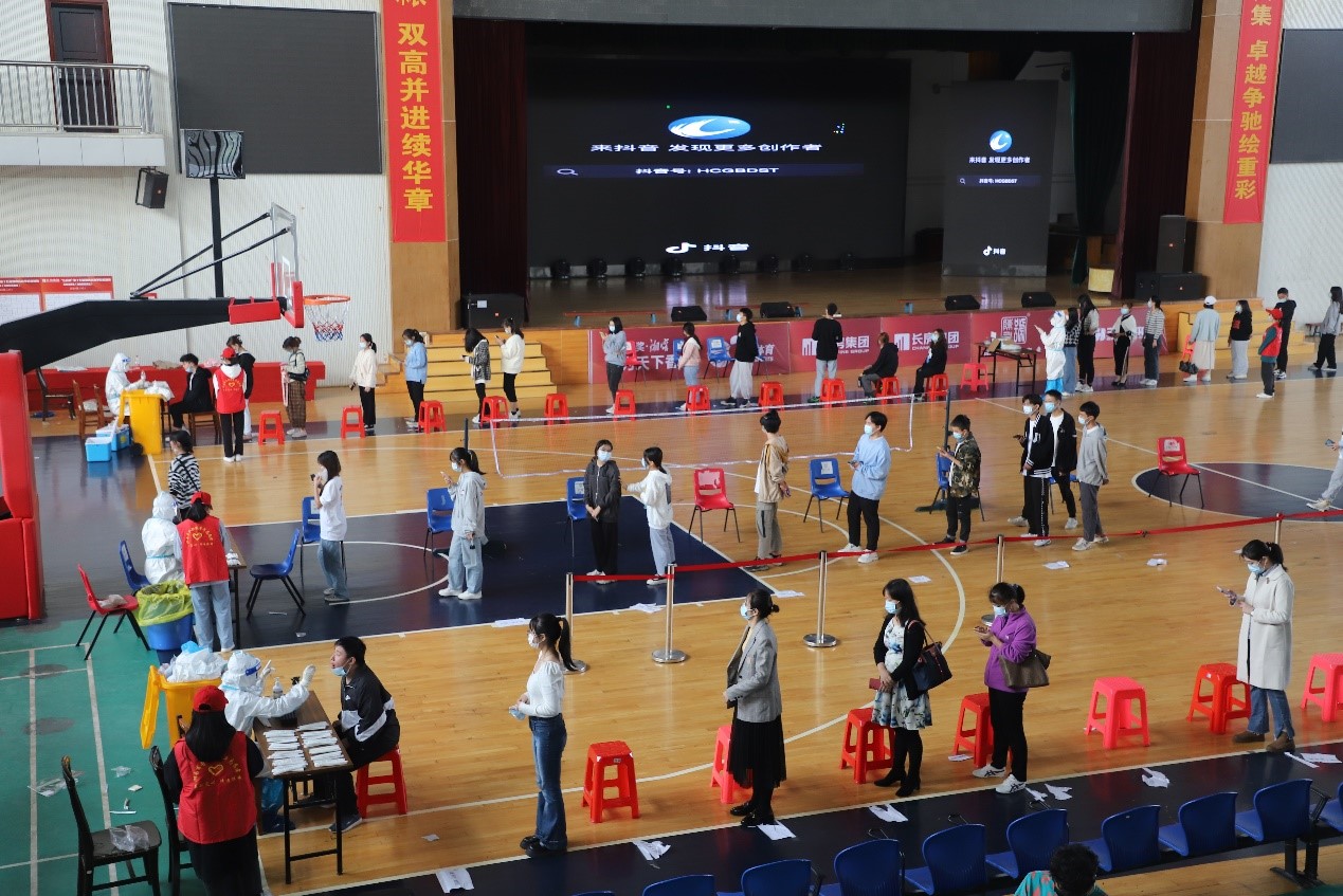 师生均佩戴口罩,在体育馆外有秩序的排队等候做核酸检测。体育馆内还播放着新冠肺炎的自我防护知识。