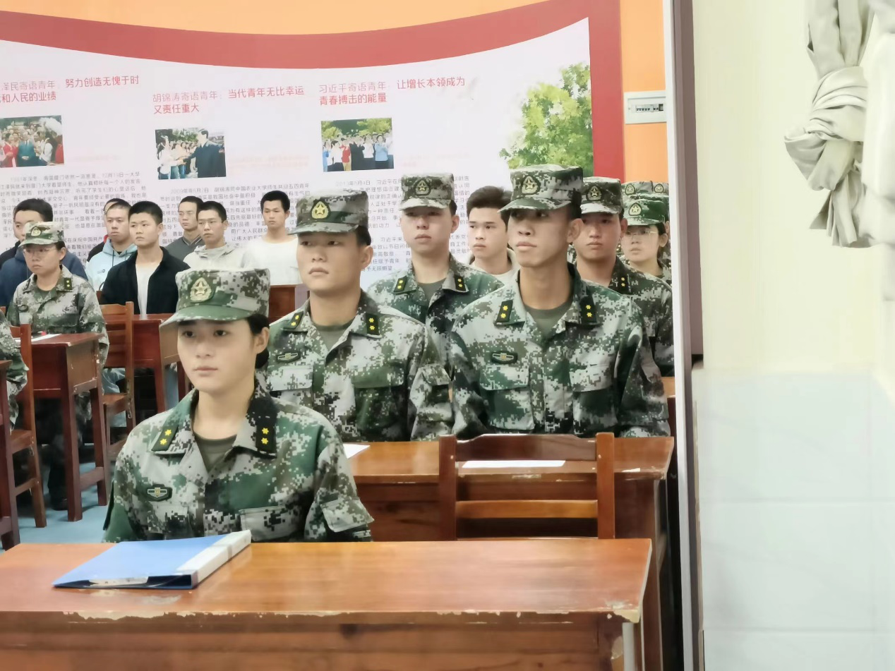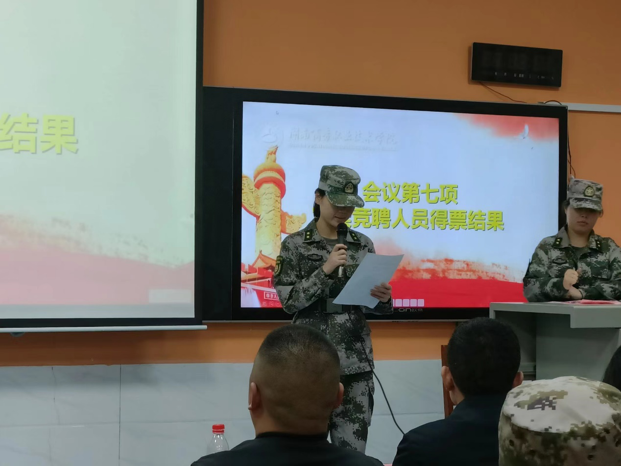 湖南商务职业技术学院于2022年11月23日下午14:30在二教-110教室举行第六届学生教官自训队管理干部换届竞聘大会,学工部部长杨明、学工部副部长张庆、帮训单位南国利剑相关领导、武装部罗永红老师、学工部戴娟老师出席会议,第五届学生教官管理干部、第五届留队人员及第六届全体队员参加会议。