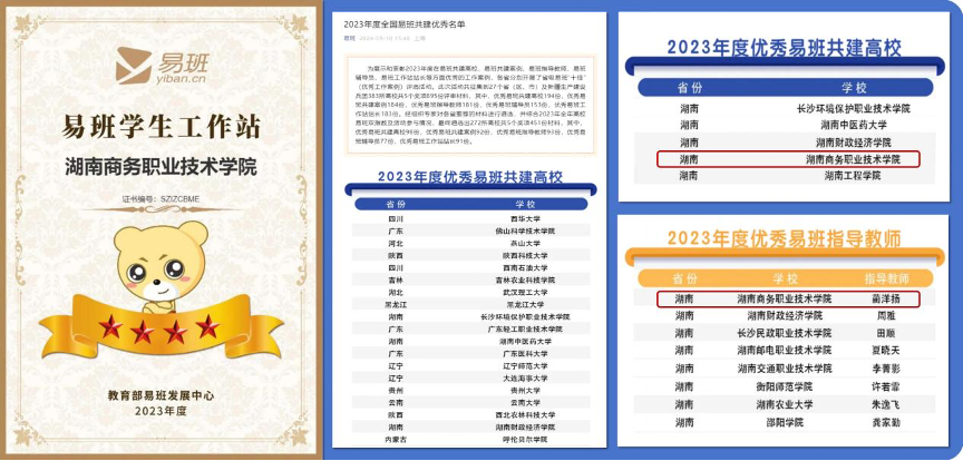 据悉,我院易班学生工作站在2023年度的评选中,从全国众多高校工作站中脱颖而出,成为59所获此殊荣的高校之一(湖南省共5所)。日前,经组织专家对各省推荐的材料进行遴选,并综合2023年全年高校易班双指数及活动参与情况,我院易班建设工作在全国成效显著,在参评的194所高校中获评“优秀易班共建高校”(全国98所,其中湖南5所)。