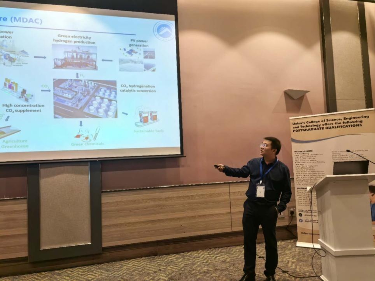 汪靖伦副院长和张宇晟博士受邀代表湖南科技大学分别作了“Design and Application of Novel Fluorinated Nitrile Electrolyte Materials”和“Mobile Public Transportation System Direct Air Carbon Capture”的学术报告,周再春教授作了“Semiconductor effect of Pd(II) porphyrin in photocatalytic dealkylation”的墙报展示。