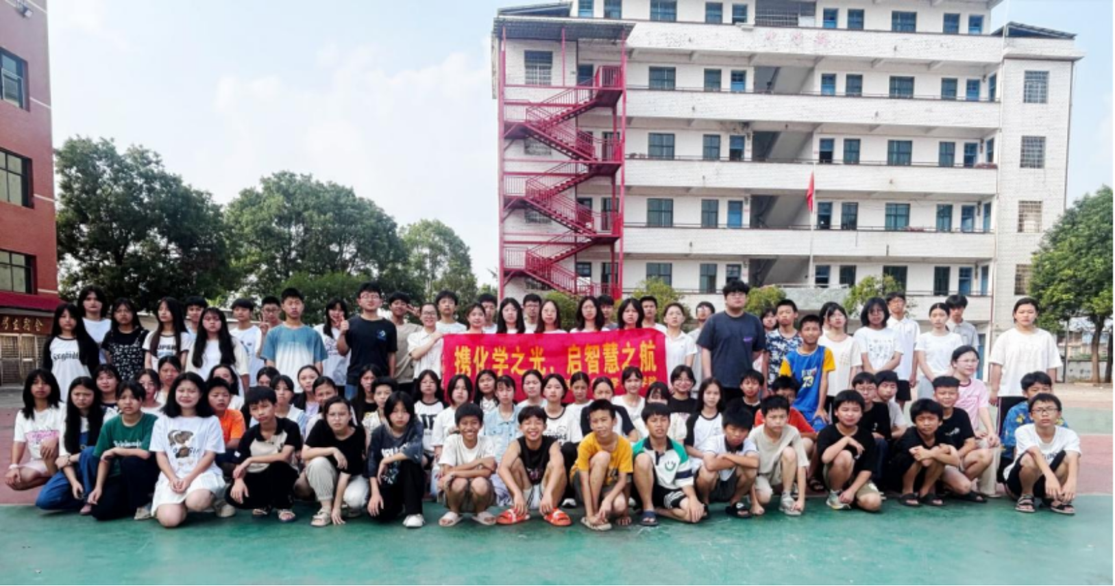 在衡阳祁东县成龙学校,实践队拉开了活动序幕。活动以“携化学之光,启智慧之航”为主题,面向该校70余名初中生,精心设计系列趣味化学实验与科普讲座。队员们担任科普讲师,通过“大象牙膏”、“彩虹分层”、“水果电池”等安全、直观、富有趣味的实验演示及浅显易懂的原理讲解,将抽象化学知识转化为神奇的科学现象,有效激发了学生的好奇心与探索欲,播撒下热爱科学的种子。