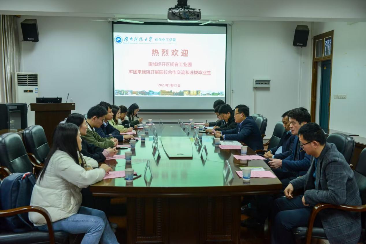 望城经开区铜官工业园综合协调部副部长易耀感谢湖南科技大学化学化工学院的邀请,希望能进一步加强园校合作,共同助力大学生就业。他表示,园区致力于推崇学生专业与企业的贴合,也希望能进一步扩大园校合作规模,并邀请学院领导去园区进行考察交流。