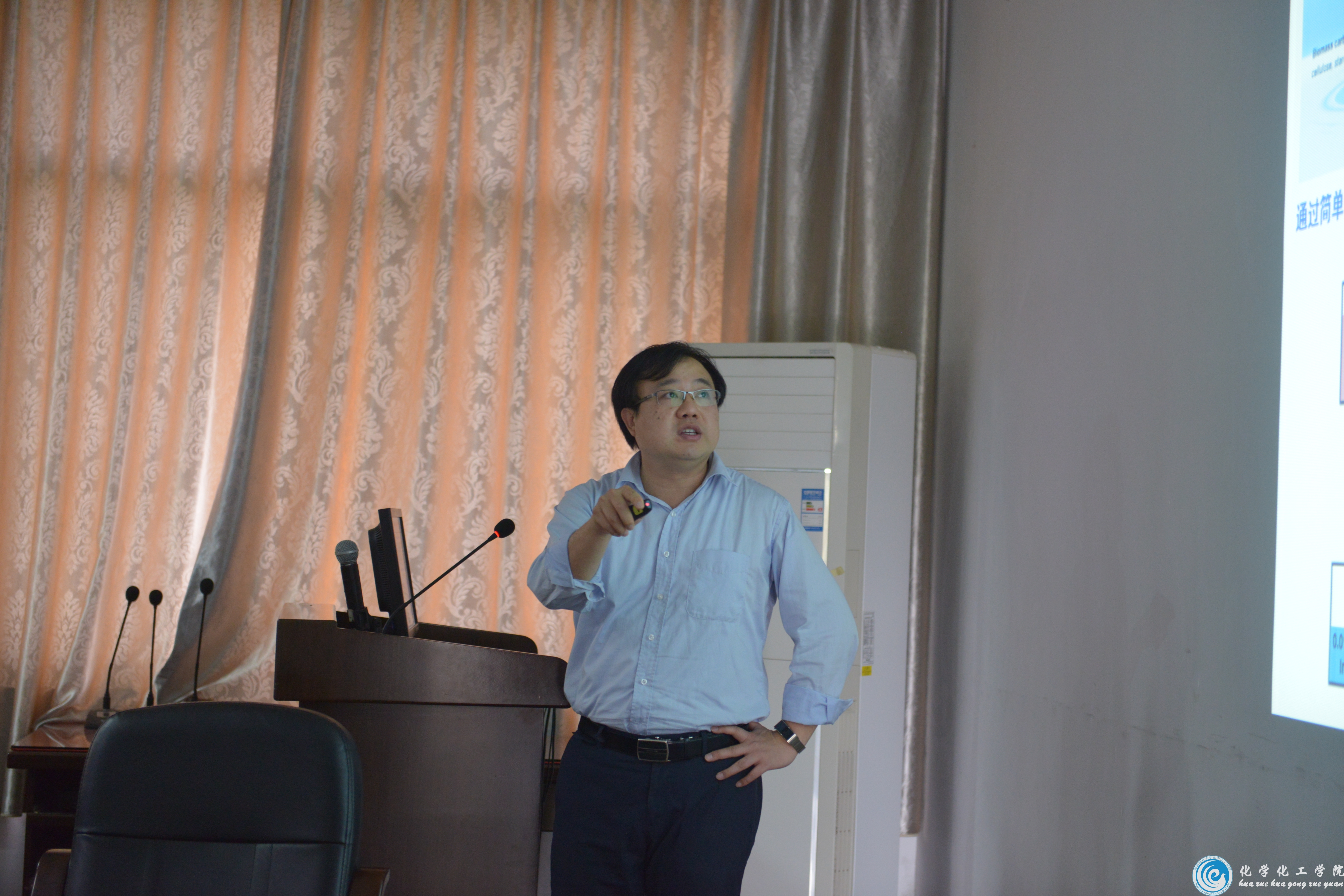 会上,傅教授首先介绍生物质资源研究的相关背景,特别强调发展生物质资源的高附加值利用的重要意义。紧接着,他针对半三明治型金属lr络合物催化生物质糖类衍生物的水相氢化反应和三氟甲磺酸金属盐活化生物质基平台化合物C-O键的选择性氢解分别进行了详细讲解。最后,傅教授指出该研究目前还面临着生物质原料的过度含氧官能团化,以及发展选择性保留或去除特定含氧官能团的绿色合成方法这两大挑战。