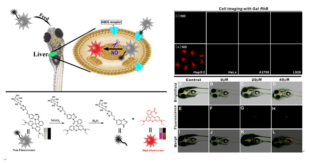 近日,湖南科技大学理论有机化学与功能分子教育部重点实验室的张培盛博士研究团队首次报道了一种肝靶向NO荧光探针(Gal-RhB),实现了斑马鱼内肝脏中NO的原位成像检测。Gal-RhB以市售罗丹明B为母体结构,通过将邻苯二胺(NO识别基团)和半乳糖(肝靶向基团)引入罗丹明B结构中,构建了肝靶向NO荧光探针(Gal-RhB)。半乳糖基团的引入不仅增加了探针的水溶性,也有利于探针被肝细胞特异性摄取。细胞和活体成像研究表明:该荧光探针(Gal-RhB)能够被肝细胞特异性摄取,并应用于肝细胞和肝脏中NO的荧光成像分析。该研究对进一步了解NO与肝脏相关疾病的发生发展作用研究具有重要的意义。