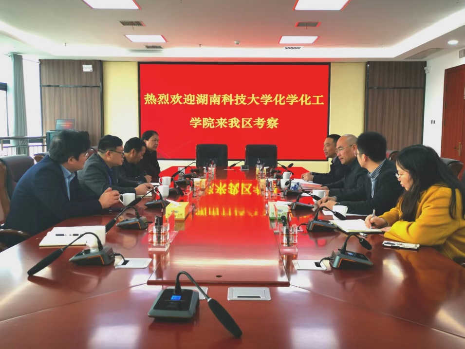 3月3日上午,周虎院长一行首先考察了位于化工园区的湘乡经开区管委会,经开区党工委副书记、管委会主任李应培,湘乡绿色化工投资集团有限公司总经理刘亮,湘乡经开区经济合作局局长胡国要和经开区科创服务中心主任刘见芬对周虎院长一行表示热烈欢迎,详细介绍了经开区的建设规模、产业分布、未来规划等方面的情况,并殷切期望与湖南科技大学化学化工学院在人才培训、产学研合作等方面有更加密切的合作。周虎感谢湘乡经开区管委会和相关公司领导对此次考察交流的重视,并从师资力量、人才培养、科学研究等方面详细地介绍了学院的基本情况,提出在新材料、医药、环保等方面探讨合作,助力经开区快速发展。