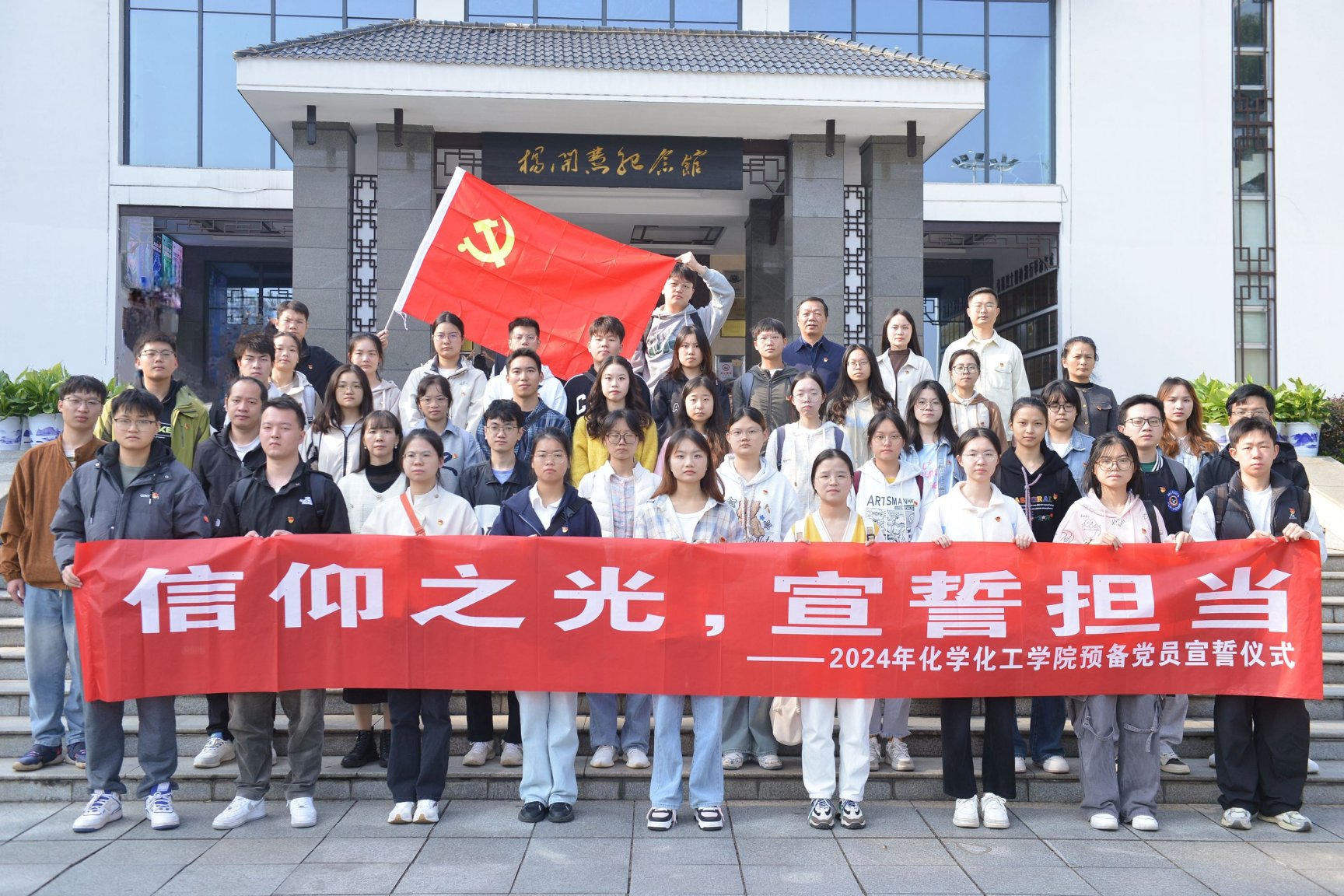仪式宣读了2024年新发展预备党员名单,每一个名字都承载着新的希望与力量。在宣誓环节,化学化工学院本科生第三党支部副书记陈秋月同志领誓,预备党员们举起右拳,庄严宣誓,表达了对党的无限忠诚和为共产主义奋斗终身的坚定决心。