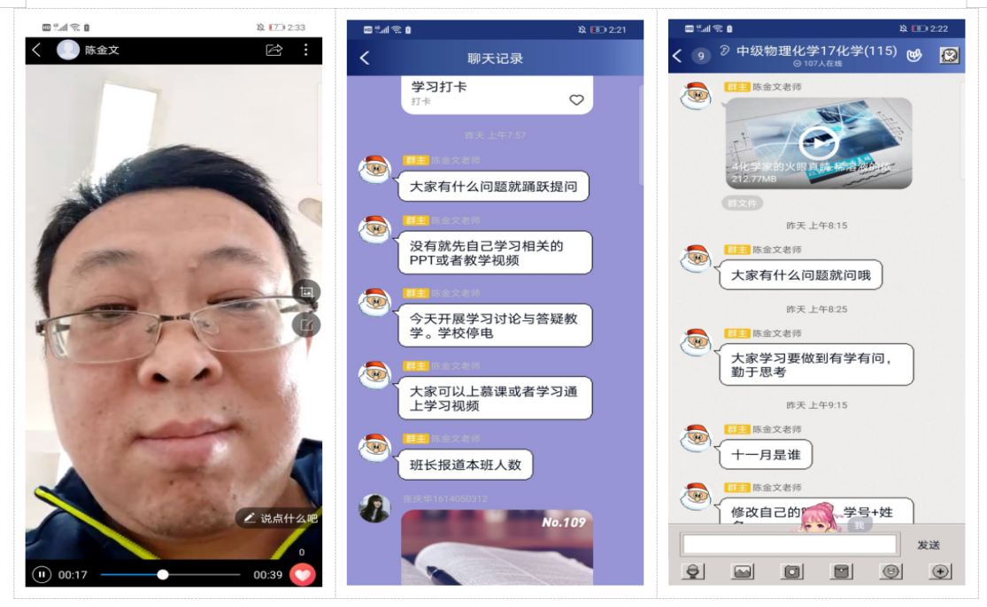 陈金文老师:在第一次QQ群直播课堂上,就给同学们强调了新型冠状病毒与化学的联系,强调了学习的重要性。借助超星学习通安排课后作业,在每次批改作业后会将学生错误较多和不理解的地方再讲解,确保每位同学对知识点的理解,带领学生进行归纳总结,保证了教学质量。同学们表示陈老师的课堂亲切且有感染力,明确了自己的学习方向。