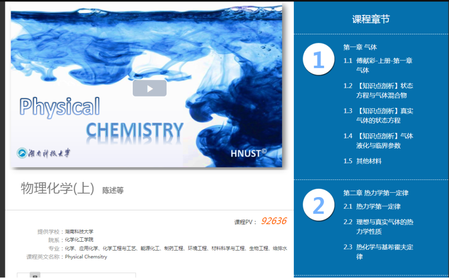 物理化学课程面向化学、化学工程与工艺、能源化工、应用化学、制药工程、环境工程材料化学、生物技术和给排水专业开设的基础课程。《物理化学》作为2019年省级精品在线课程建设,目前已完成线上课程布局。(http://mooc1.hnust.edu.cn/course/204096165.html)