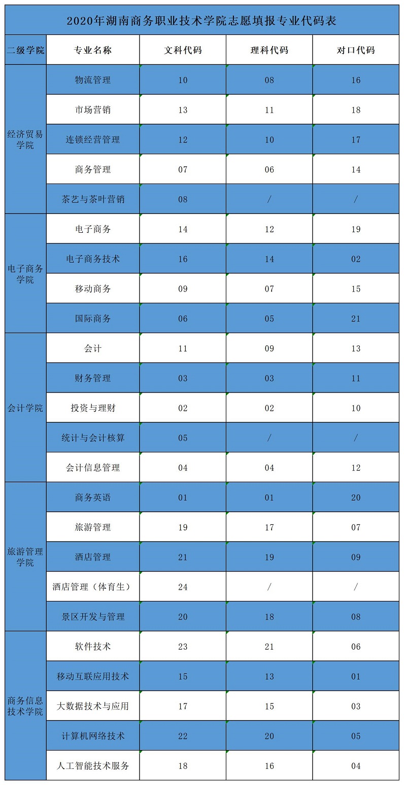 2020年湖南商务职业技术学院志愿填报专业代码表