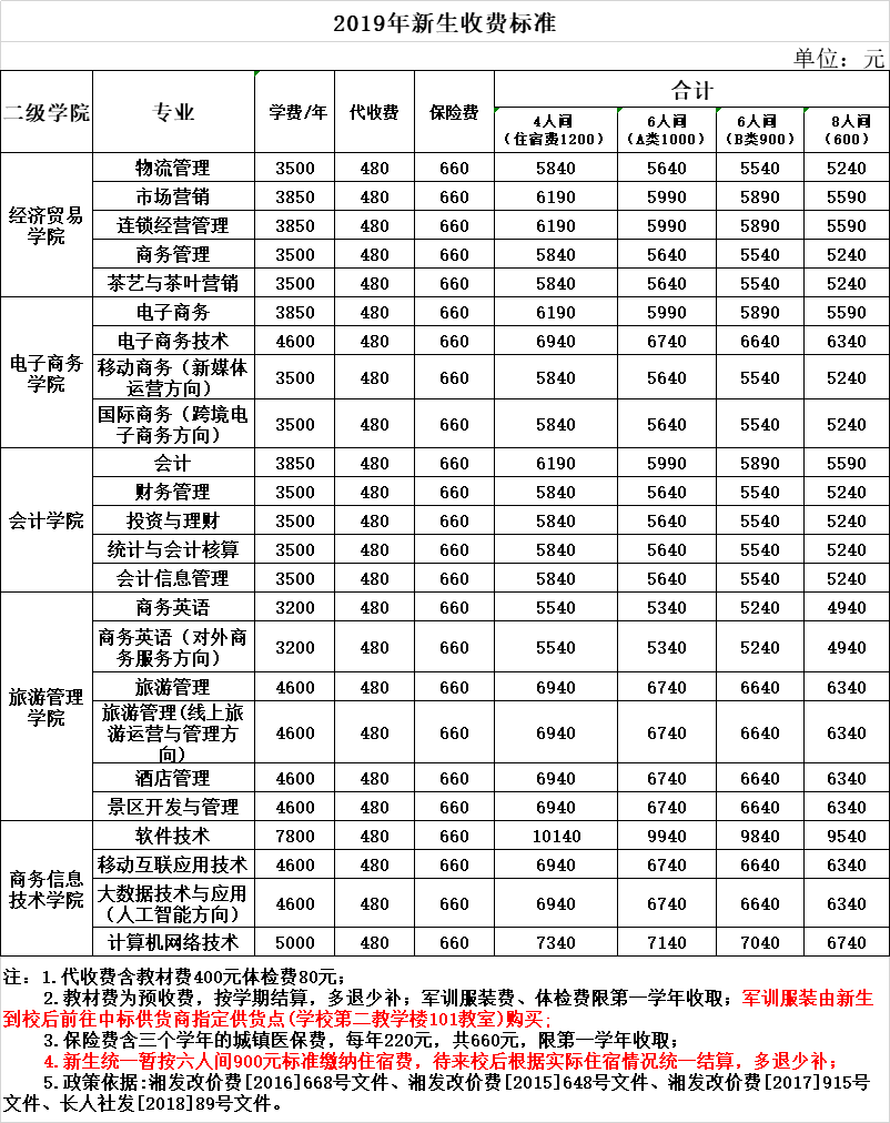2019年新生收费标准