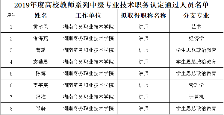 根据省教育厅职改办通知精神,我院2019年度高校教师系列中级专业技术职务认定工作已经结束,黄冰凤、潘海燕、曹璐、袁勤思、陈博、李宇雯、冯准、邹磊共8位同志通过了认定,现予以公示。如有不同意见,请于2019年12月25日至12月31日内向组织人事处或纪检监审处反映。